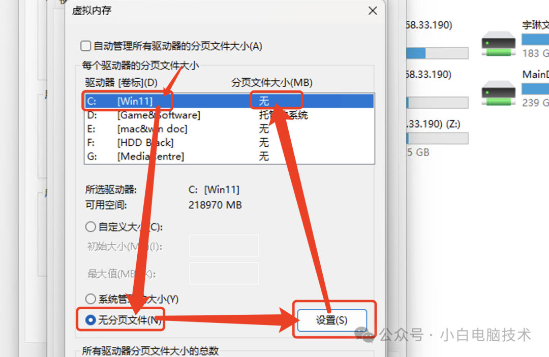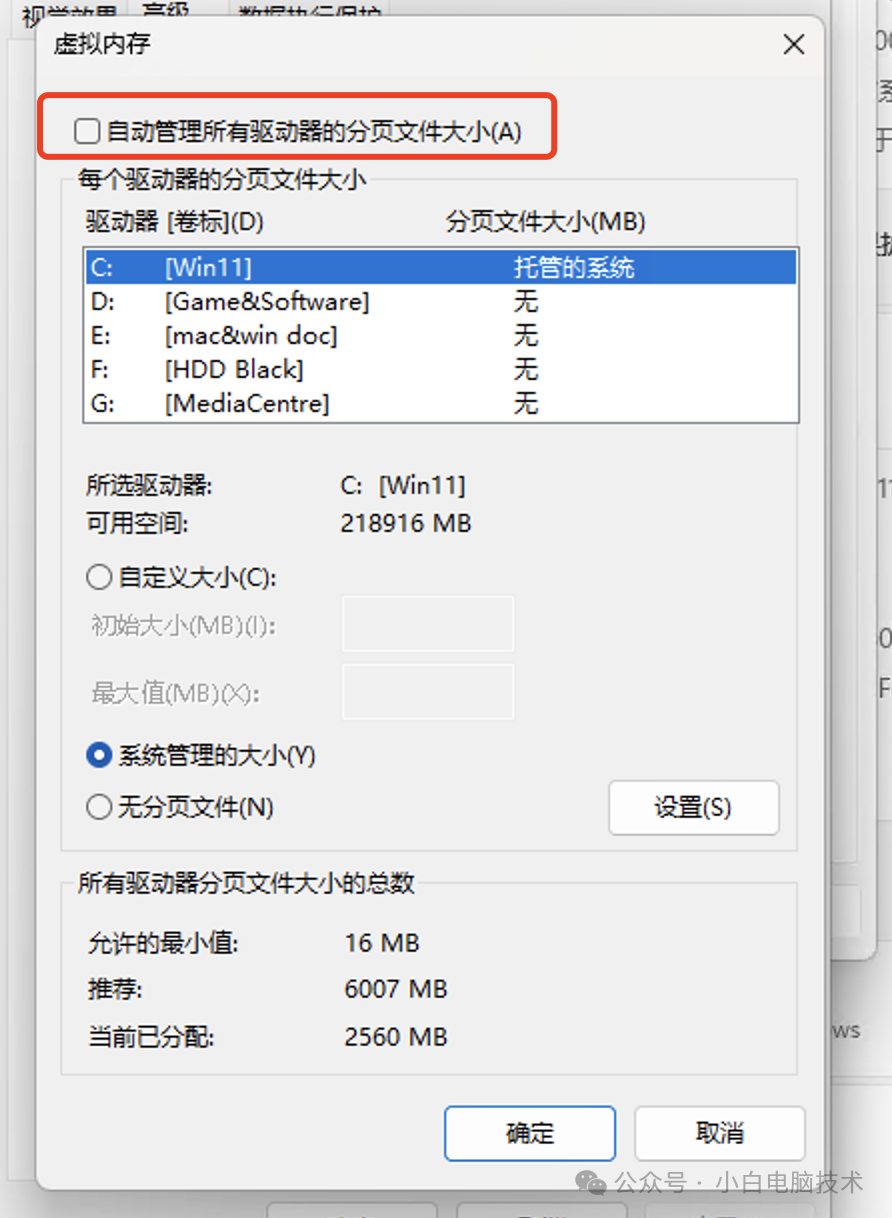 把【自动管理所有驱动器的分页文件大小】先关掉
