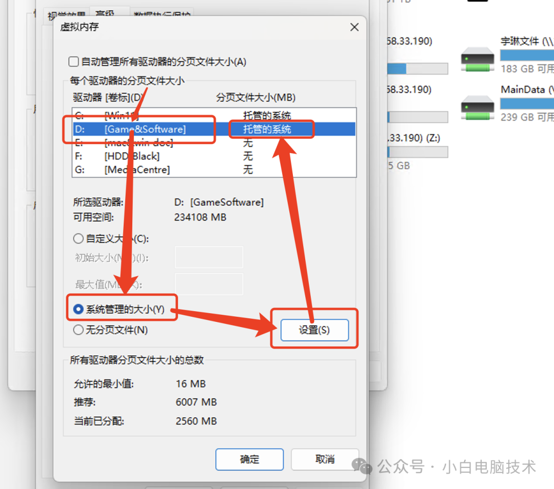 我这里先设置D盘为虚拟内存使用盘,选择【D】再点击【系统管理的大小】-【设置】,就会看到D盘被标注为【托管的系统】
