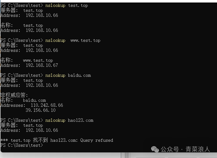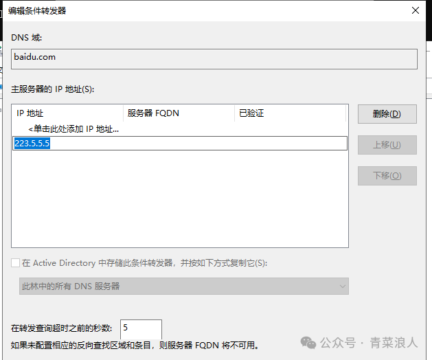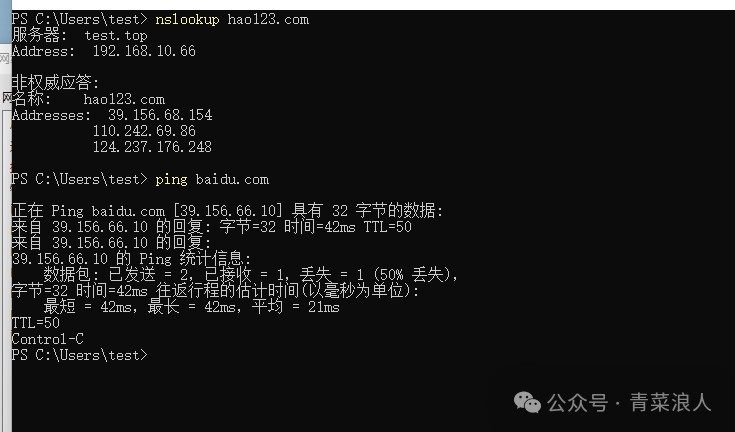 2.使用nslookup测试域名解析 此时转发器只会将域名为baidu.com的请求转发至223.5.5.5进行解析