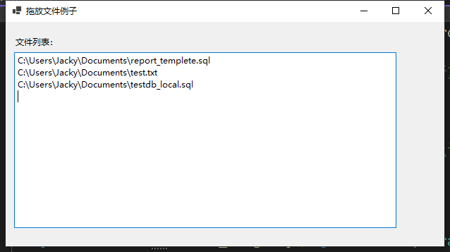 5. 编写 DragEnter 事件代码这个事件在用户开始拖动文件进入 我们需要在这里检查拖动的数据是否是文件。 5. 编写 DragDrop 事件代码这个事件在用户释放鼠标按钮,完成拖放操作时触发。 我们需要在这里处理文件路径。 6. 运行应用程序保存并运行应用程序。 现在,你可以尝试从文件管理器中拖动文件到你的应用程序窗口,文件路径将会显示在