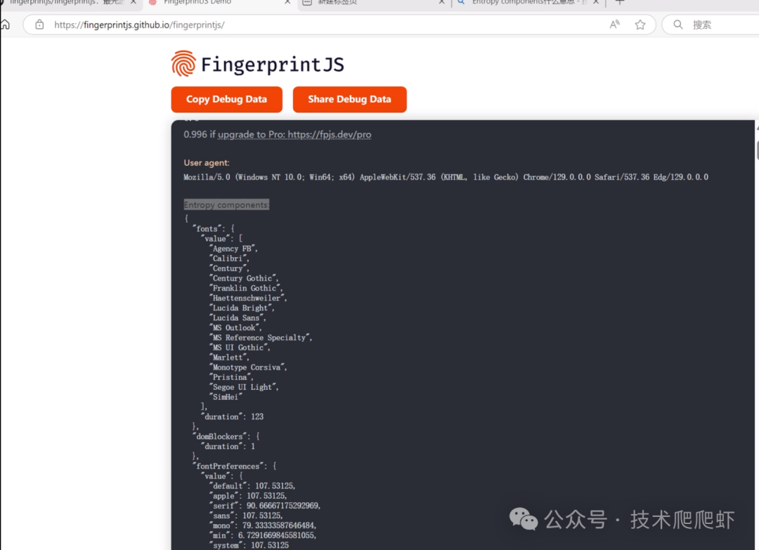 我们往下找,找到这里的Demo,点击这个链接,就可以进入视频开头的那个演示网站。这里显示出根据浏览器指纹计算出来的访客ID。除了ID以外,下面还有一系列计算访客ID所需要的特征值。