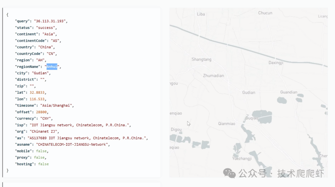 我们可以看到,这个IP地址的归属地是安徽,并且右边给出了一个地图,显示出了大概位置。这里还有对应的经纬度,isp也就是运营商的名字,这里显示出的是江苏电信。