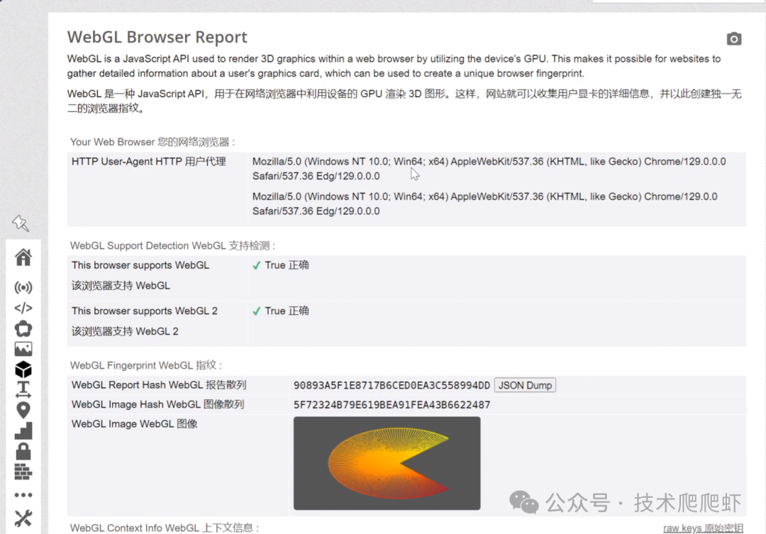 这个收集用户浏览器指纹的方式跟那个canvas有点像。网站首先绘制这么一个3D图像,然后他分析这个图像细节上的微小不同,生成一个哈希值。这个哈希值就可以精确的反映我电脑显卡的一些硬件特性还有一些细微的硬件设置。