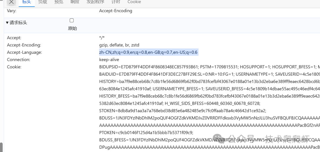 我们还是从刚才的那个请求里,在Header的RequestHeader里面,这里有一个Accept-Language,里面有这么一串的内容。这里面是许多语言的类型,通常按照用户设置的偏好进行排列。