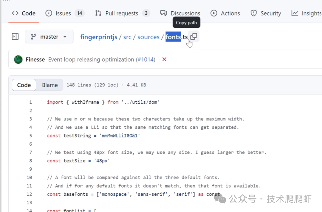 浏览器可以通过一些复杂的JavaScript脚本列出用户设备上所有可用的字体。我们找到视频开头说的这个Fingerprint js这个库,我们在它的源代码里面可以找到这个fonts.ts文件。