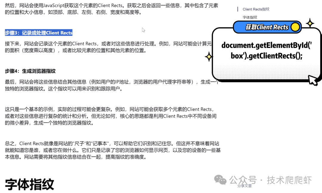 3. 第三步处理或者记录这个Client Rects,比如网站可能会计算元素的面积或者比较元素的位置跟其他元素位置的相对信息