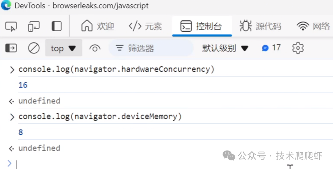 网站可以通过js代码获取两个硬件指标,这两个硬件指标同样可以作为浏览器指纹。我们还是打开浏览器的控制台,我们先输入第一个命令,这个navigator.hardwareConcurrency,这里指的是你电脑一共有多少个线程。我的电脑是8核16线程的,这里显示出了16。