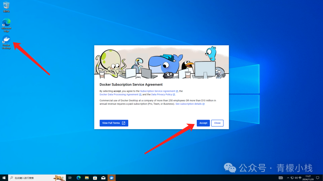重启完成后,我们的桌面上会多处一个 Docker 的快捷方式,并且会自动启动 Docker 服务: