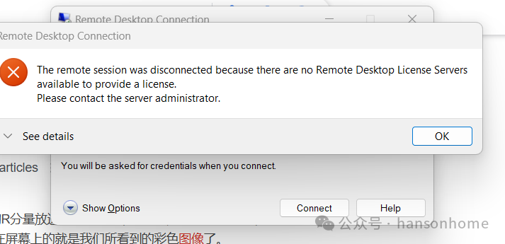 6. 许可期限在某些情况下,如果没有足够的 CALs,用户或设备仍然可以在有限的时间内(即 宽限期)连接到远程桌面服务主机。但宽限期结束后,必须安装合法的 CALs,否则用户将无法继续连接。 本文落笔前遇到的问题:宽限期政策(Grace Period),也就是120天宽限期已过,就会报错,无法再次连接。