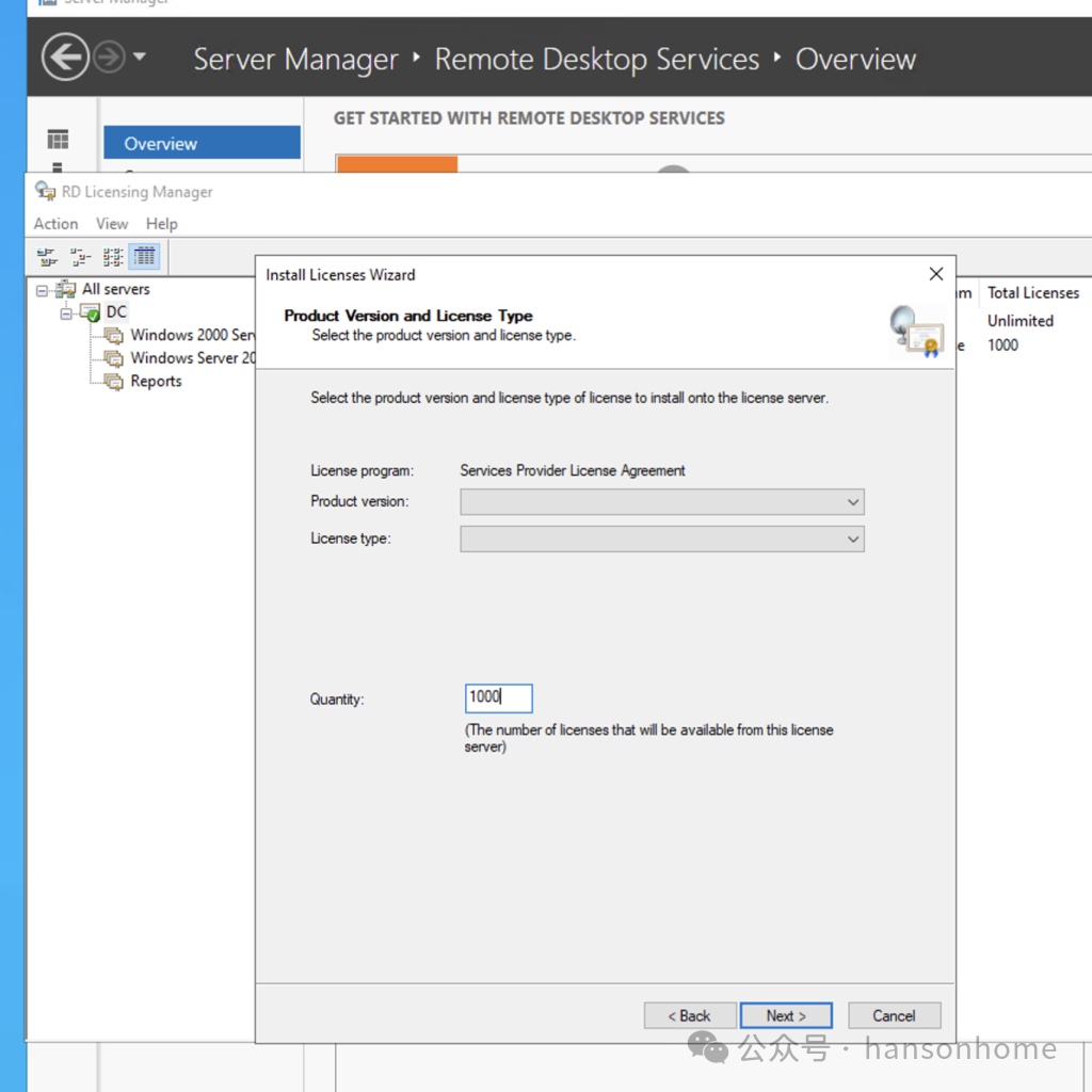 配置步骤1. 在域控制器(DC)上部署远程桌面许可服务 由于家庭网络资源有限,将 RDS 许可服务安装到域控制器上是节省资源的合理做法。