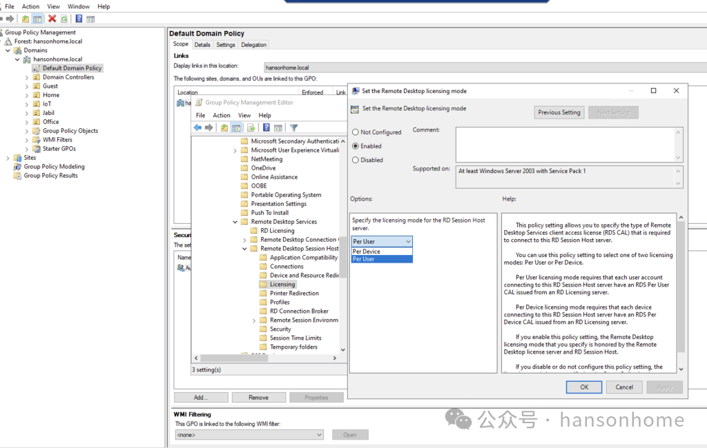 3. 配置组策略指定许可服务器和模式接下来,通过组策略为网络中的终端服务器指定许可服务器,并设置许可模式为