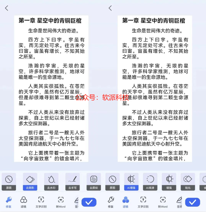 在图像处理方面,这款工具的修复和滤镜功能同样出色,它能够实现去阴影、去水印、去手写等效果,让扫描出的文档更加清晰、整洁。