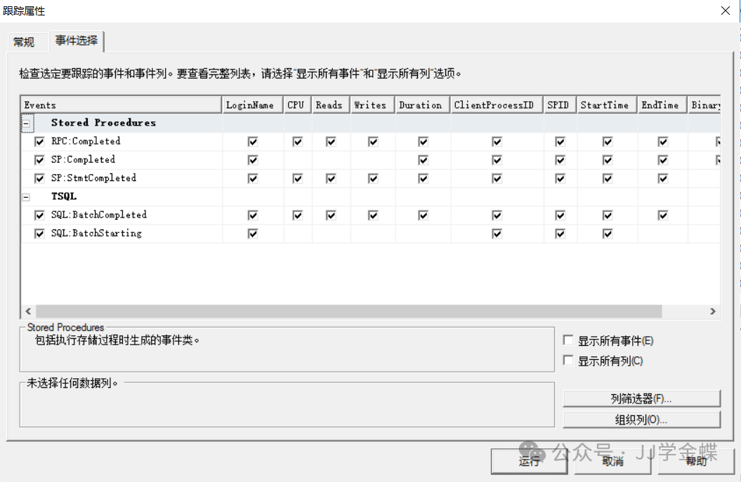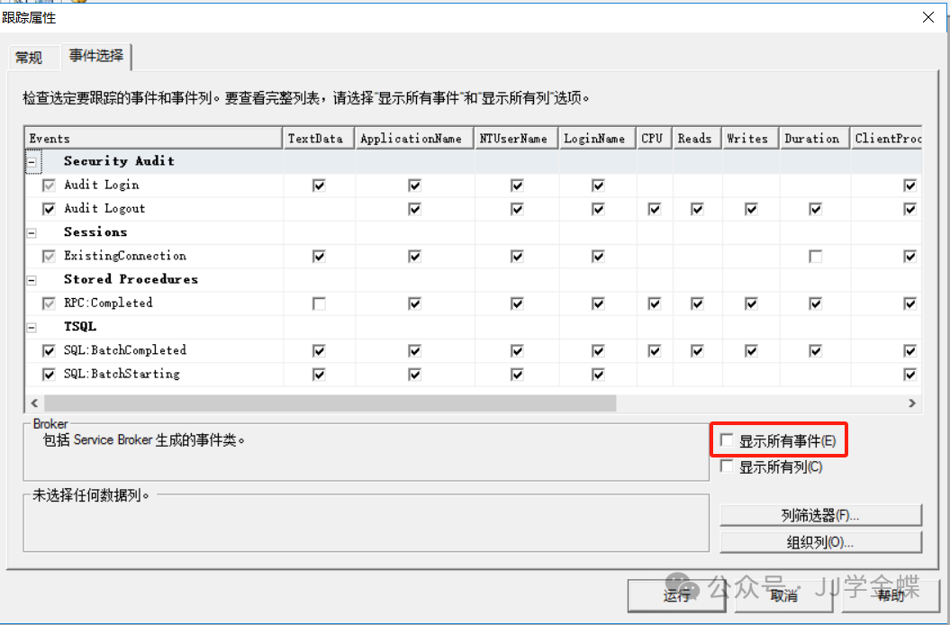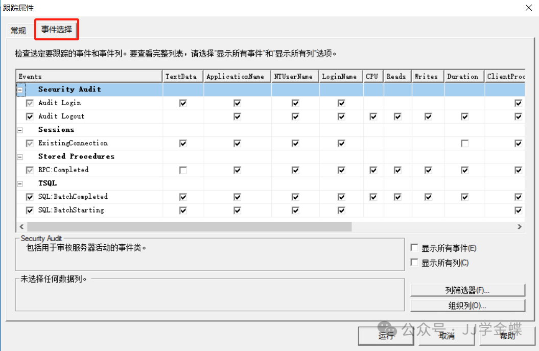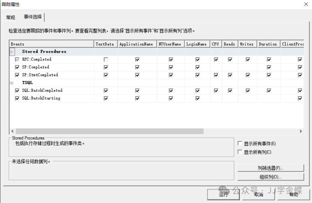 事件选择窗口: 在该图中设置需要跟踪的SQL Server事件类。主要用来跟踪SQL语句和存储过程的事件,通常情况下只要设置TSQL事件类的SQL:BatchCompleted,SQL:StmtCompleted事件和存储过程事件类RPC:Completed、SP:Completed,SP:stmtCompleted事件即可。 系统默认如下: