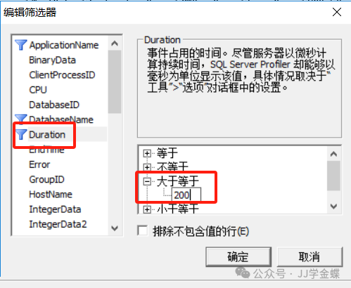 选择Duration的编辑筛选器,将其设置为大于等于200。为了不使跟踪文件过大,在筛选条件上选择Duration>=200的事件,因为执行周期很短的SQL不是我们在性能分析中关注的重点对象,同时全部SQL都跟踪会很多。