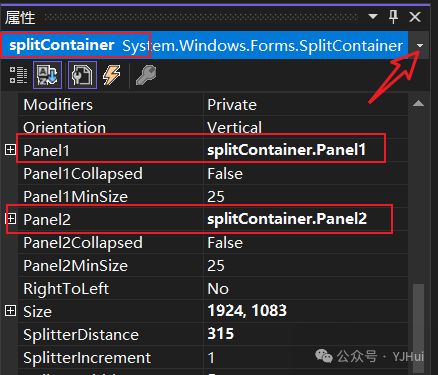 在工具栏中找到容器下的splitContainer进行添加,添加后可以将界面拆分成上下或者左右两部分。由于控件不好选择,可以在属性位置处点击下拉框选择splitContainer控件,其中Panel1和Panel2是自动拆分的两个区域。同样的在属性位置处点击下拉框选择splitContainer.Panel1和splitContainer.Panel2对拆分区域的属性进行设置。本例中将左侧区域设置为切换界面选择区域,右侧设置为显示界面区域。判断打开新窗体前右侧区域是否有打开的窗体,如果有则关闭旧窗体打开新窗体。private void ClosePreForm(){ //嵌入窗体前,判断当前容器中是否存在窗体,存在的话将其关掉 foreach (Control item in this.splitContainer.Panel2.Controls) { if (item is Form)//如果里面有窗体 { Form objControl = (Form)item;//将item转换为Form窗体类型 objControl.Close();//关闭
