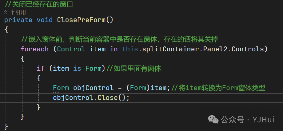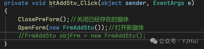 调用以上两个方法打开指定窗体,FrmAddStu为新窗体名称 ClosePreForm();//关闭已经存在的窗体 OpenForm(new FrmAddStu());//打开新窗体