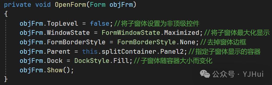 创建一个OpenForm打开新窗体方法objFrm为新窗体名称private void OpenForm(Form objFrm){ objFrm.TopLevel = false;//将子窗体设置为非顶级控件 objFrm.WindowState = FormWindowState.Maximized;//将子窗体最大化显示 objFrm.FormBorderStyle = FormBorderStyle.None;//去掉窗体边框 objFrm.Parent = this.splitContainer.Panel2;//指定子窗体显示的容器 objFrm.Dock = DockStyle.Fill;//子窗体随容器大小而变化 objFrm.Show();}