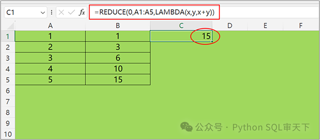 再来看REDUCE函数,它直接就是一个总和15,不显示中间过程。