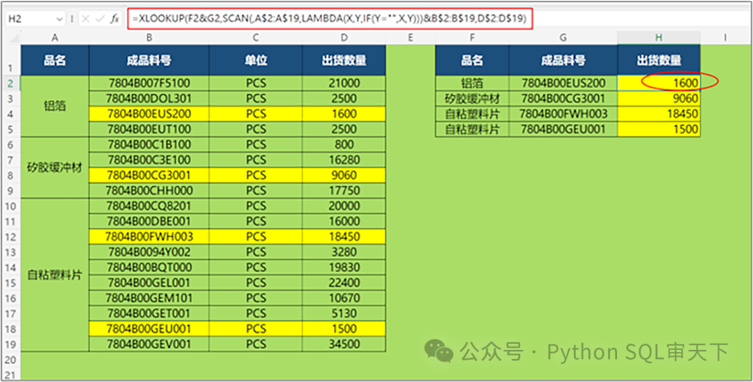 =XLOOKUP(F2&G2,SCAN(,A$2:A$19,LAMBDA(X,Y,IF(Y="",X,Y)))&B$2:B$19,D$2:D$19)