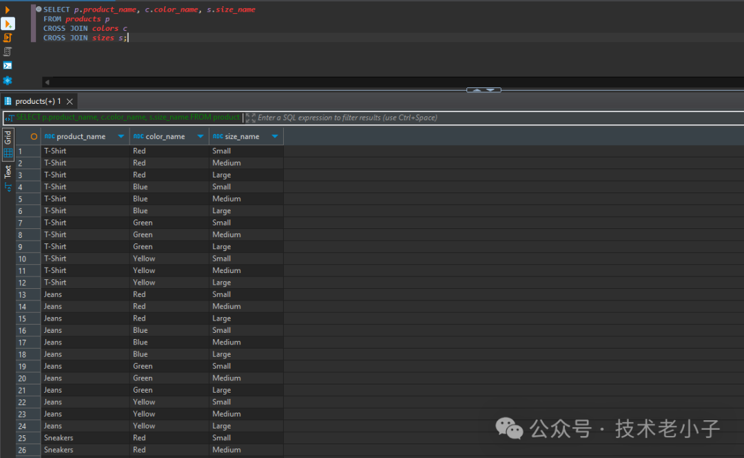 首先,让我们创建一些测试表和数据来演示交叉连接的使用。我们将创建一个简单的产品组合系统,包含颜色、尺寸和产品三个表。