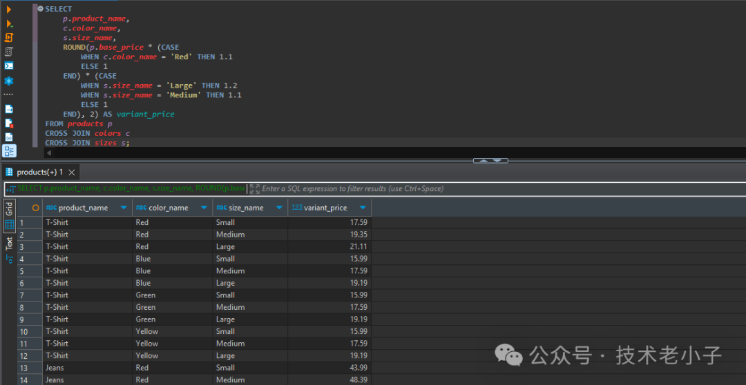 这个查询生成了所有产品变体的价格,考虑了颜色和尺寸对价格的影响。