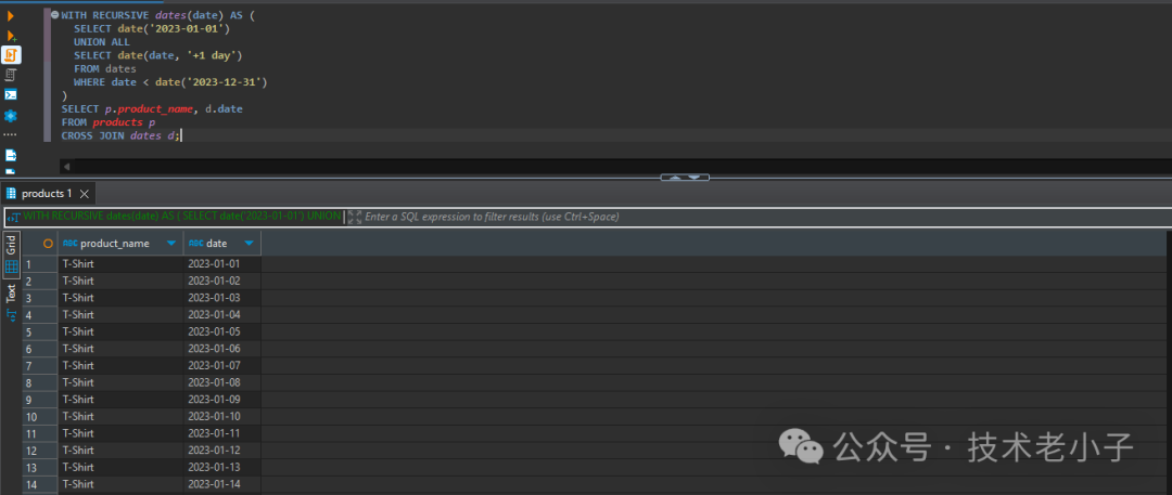 这个查询使用递归 CTE 生成日期范围,然后与产品进行交叉连接,可用于创建销售报告模板。