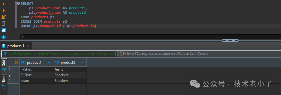 这个查询生成所有可能的产品对比组合,可用于比较分析。