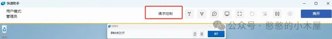 当连接上后控制端是不能控制“被控制端”的,只能看被控制端操作,相当于共享桌面,如果要控制还需要在控制端的“软件助手”上点击请求控制,之后被控制端允许,就控制端可以控制“被控制端了”。听起来有点拗口,但应该都能听明白吧,如果听不明白我也没办法。至于控制/共享结束,点一下离开按钮就行。