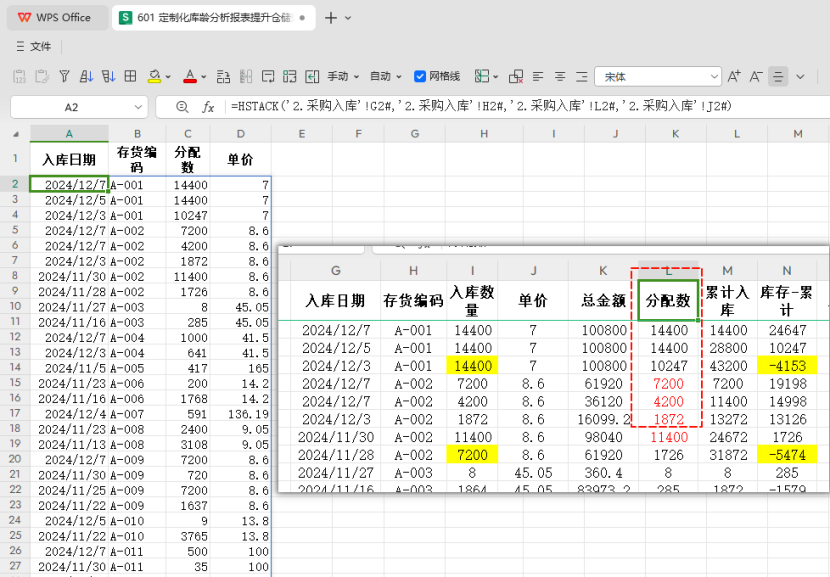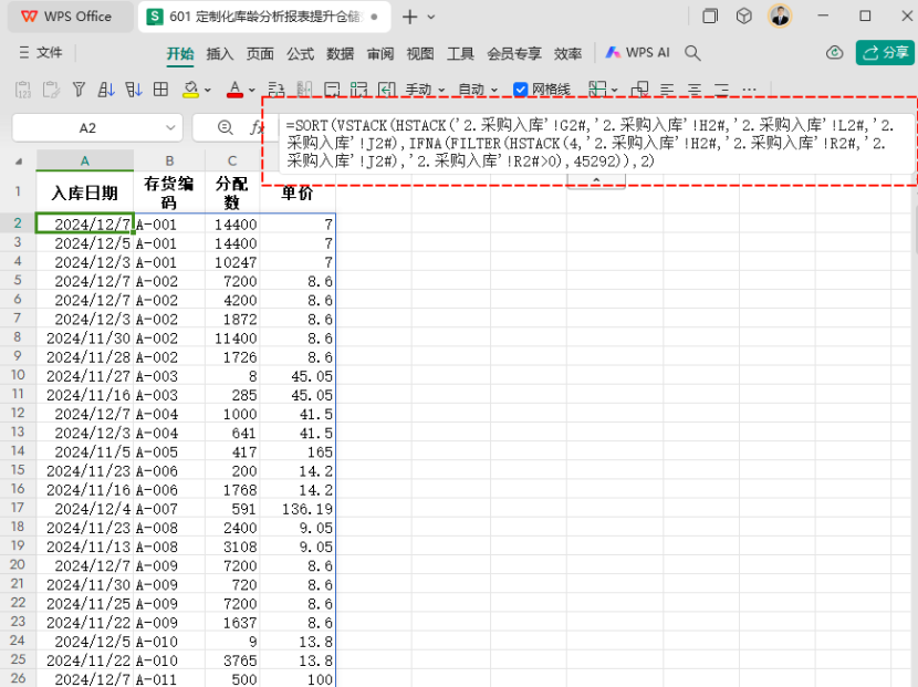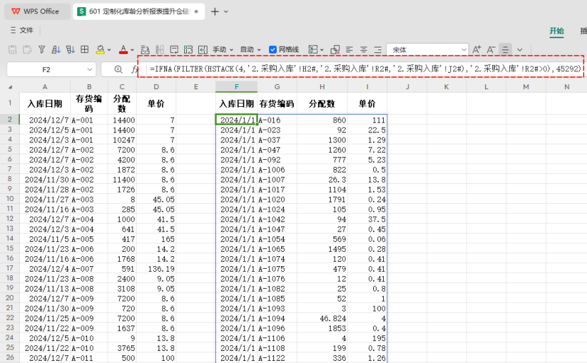 公式解释: 此公式使用HSTACK函数将《采购入库》表中相应的列("入库日期"、"存货编码"、"分配数"和"单价")的数据同步到新的工作表中。这些分配数据是核心内容,它们决定了用于库龄分析的数量基础。 为了确保超过60天的数据被正确筛选出来,并且格式与采购入库单的列一致,我们可以采取以下步骤。由于实际操作中可能没有具体的超过60天的日期数据,我们将使用一个固定的日期(2024年1月1日)作为替代,以保证这些记录在与当前日期(2024年12月11日)对比时总是显示为超过60天。录入以下公式: =IFNA(FILTER(HSTACK(4,'2.采购入库'!H2#,'2.采购入库'!R2#,'2.采购入库'!J2#),'2.采购入库'!R2#>0),45292) 公式解释: 使用 HSTACK函数将固定日期(2024年1月1日)和《采购入库》表中的相关列("存货编码"、"分配数"和"单价")的数据合并。在拼接4的时候出现错误。 使用 FILTER函数根据条件筛选数据,即“分配数”大于0的记录。最后用IFNA来把错误更正为2024年1月1日。