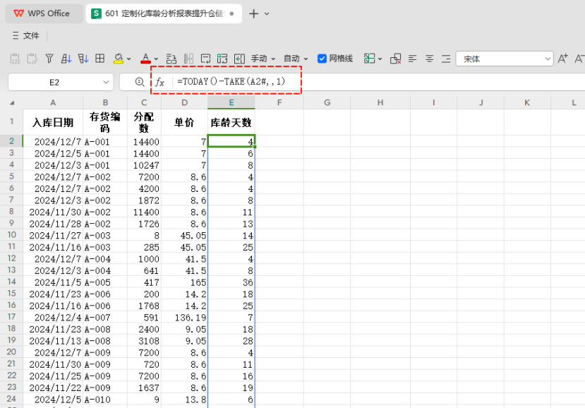 计算库龄接下来,我们将计算每一笔物料的入库库龄天数。这可以通过使用TODAY函数与入库日期相减来实现。请录入以下公式: =TODAY()-TAKE(A2#,,1) 公式解释: 使用TODAY()函数获取当前日期。 使用TAKE函数从指定范围(A2#)中提取第一列的数据,这些数据代表了“入库日期”。 然后,用当前日期减去“入库日期”,以计算出每笔物料的库龄天数。