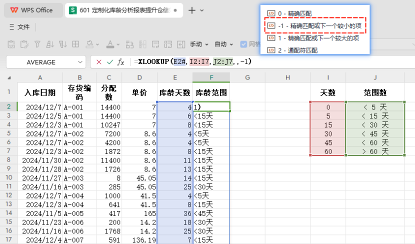 库龄范围有了上面定义的库龄天数边界范围,我们现在可以使用XLOOKUP函数来进行查找和引用。请录入以下公式: =XLOOKUP(E2#,I2:I7,J2:J7,,-1)