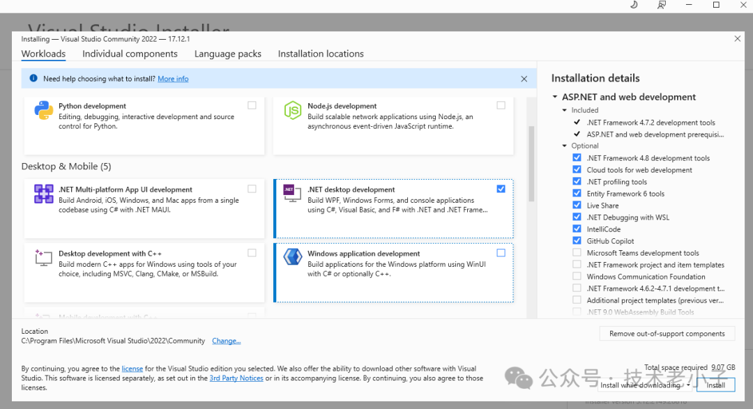 基础WINFORM开发,选择适合您项目的工作负载,并点击“安装”。