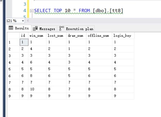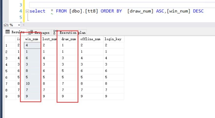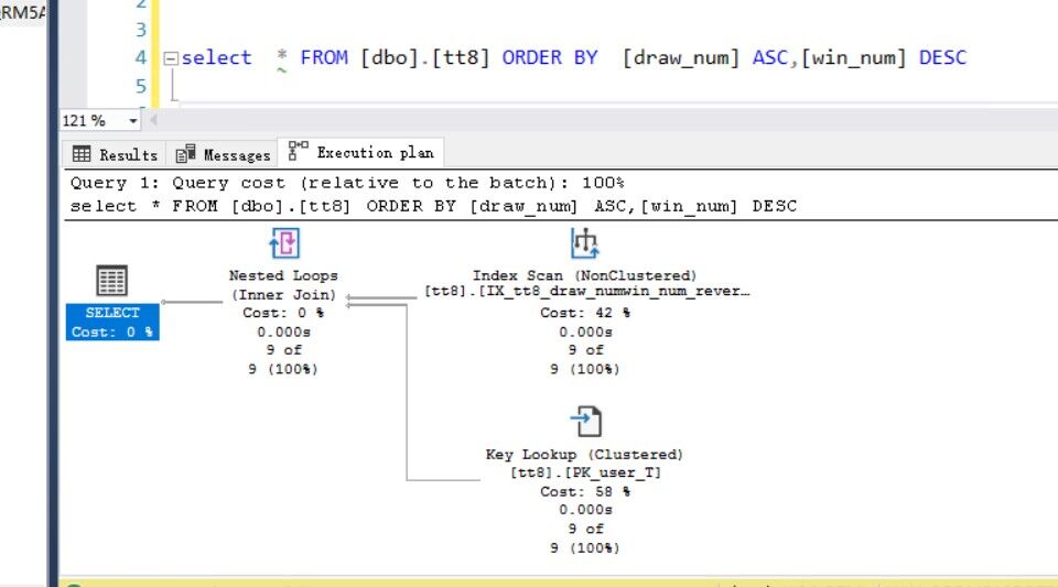 END;浏览数据 SELECT * FROM [dbo].[tt8]  2、构建查询语句 查询语句如下,可以看到这个是组合字段排序,要求按照draw_num值正序,对于相同的draw_num值,按照win_num值倒序 select top 10 * from [dbo].[tt8] order by  [draw_num] asc,[win_num] desc根据查询语句建一个非聚集组合索引 CREATE NONCLUSTERED INDEX [IX_tt8_draw_numwin_num] ON [dbo].[tt8]