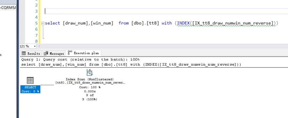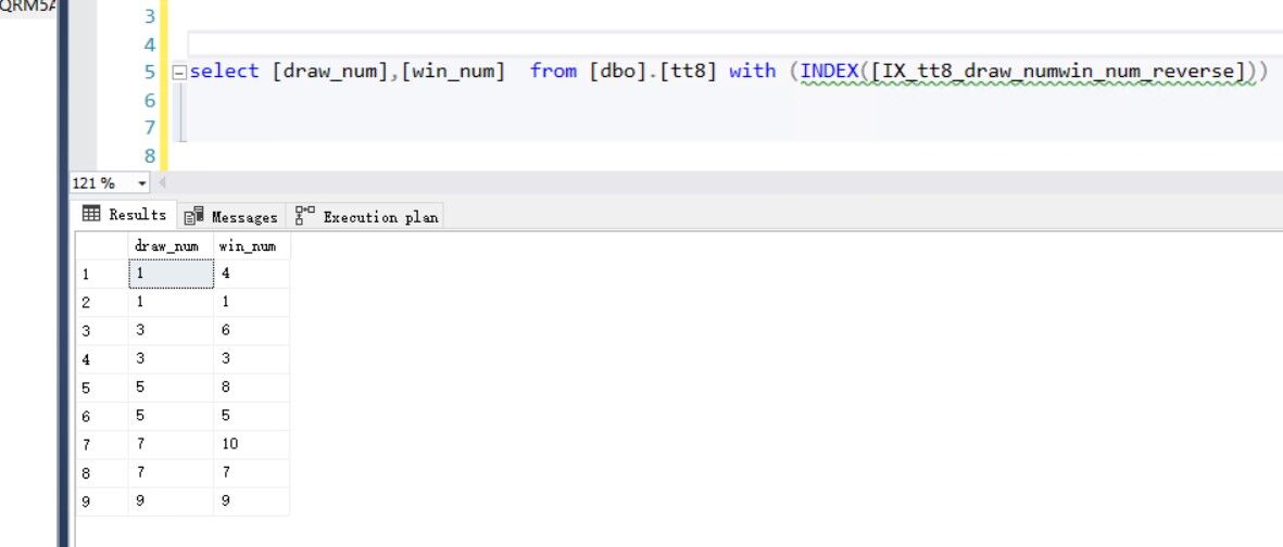 [IX_tt8_draw_numwin_num_reverse]索引的存储结构是[win_num]字段倒序,[draw_num]字段升序存储的 这个倒序索引的弊端是,当向表插入数据或者更新数据时,需要先对[win_num]字段倒序排序再插入或者更新到[IX_tt8_draw_numwin_num_reverse]索引,所以性能会有一点损耗 select [draw_num],[win_num]  from [dbo].[tt8] with (INDEX([IX_tt8_draw_numwin_num_reverse]))