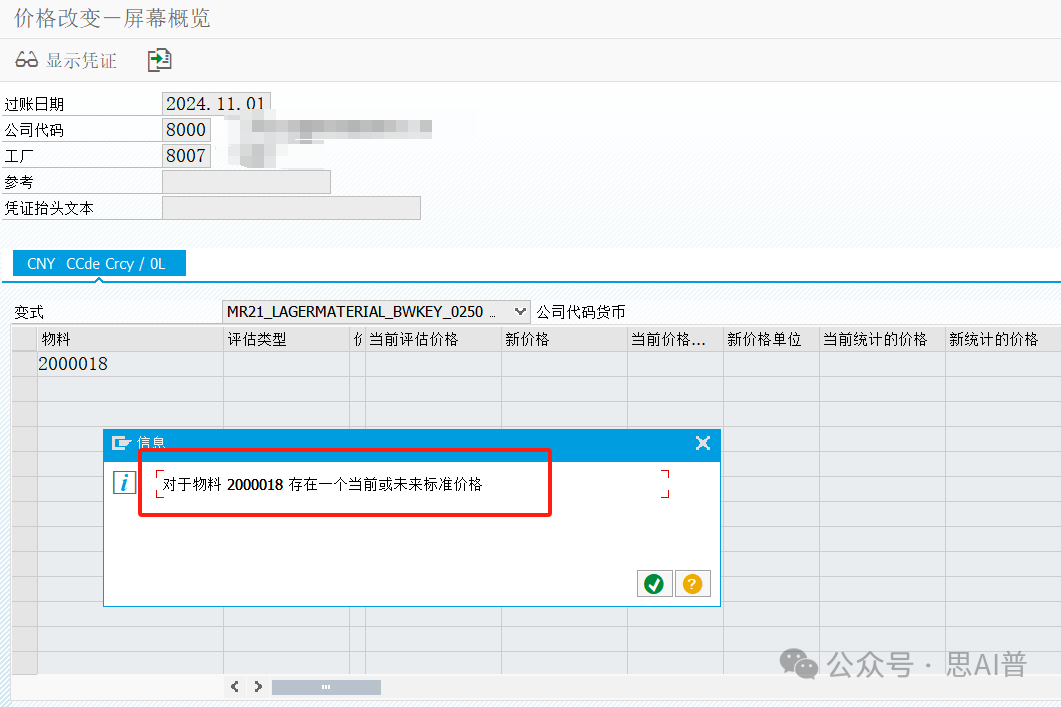 一个物料如果当期有标准价格,进行更改标准价格时系统会提示你 对于物料 2000018 存在一个当前或未来标准价格消息号 CKPRCH025 诊断存在当前或未来成本估算。过程可以通过单选按钮‘缺省计划作业价格’来设置已标记成本估算价格,且可以通过保存来发布。