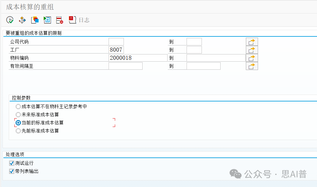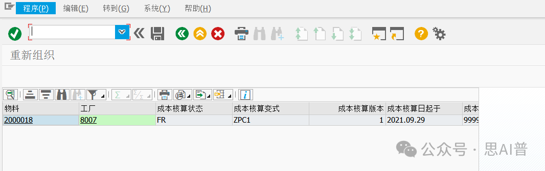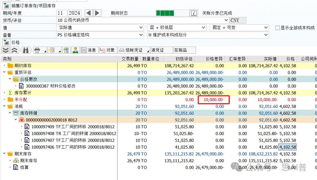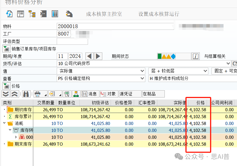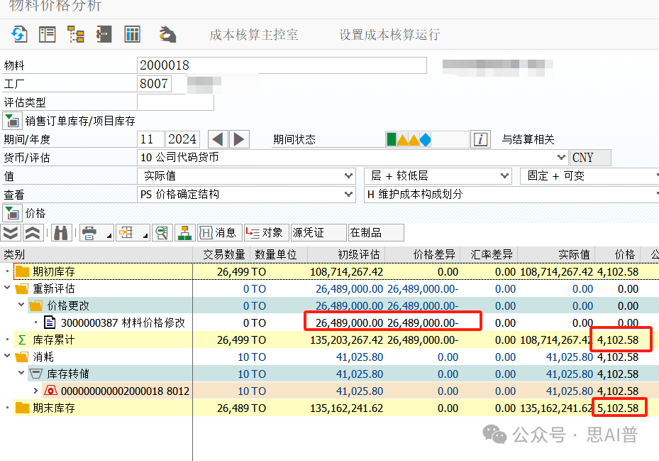 如果此物料的价格没有发布,那他的价格应是继承来的上月价格,当物料发生移动时,上月如果有价格则自动继承上月的标准价格。 我们要改变当前物料的标准价格前提是需要删除当前期间的标准价格,通过事务代码CKR1进行删除 要删除当前的标准价格则选择当前的标准成本估算,这里对应当MM03物料成本视图 去掉测试执行会有黄色提示:删除当前的标准成本估算会导致不一致消息号 CK669 诊断·如果删除了当前的标准成本估算,那么成本估算的字段在物料主数据记录里 ·设置为零。如果使用物料分类帐,那么当删除当前标准成本估算的时候,物料分类帐主数据里的标准价格也会删除。物料的物料主数据记录因而不再包含来自标准成本估算的当前标准价格。 ·如果删除了激活的标准成本估算,那么可以不再确定废品,工作过程和前一期间的変式。 ·在某些国家,维护标准定价记录是法定需求。所以,应该检查是否有义务按照法律保持标准成本估算的记录。也请联系相应的会计核算以及库存管理部门。 充分提示了影响,我们继续删除(敲回车即过) 进入如下界面之后点保存后返回,我们查看物料主数据,期间全变空了 我们在看CKM3的变化 此时CKM3并没有发生变化,也证明了两个问题: 1、删除标准价格可以不冲销物料移动凭证 2、删除历史标准价格不影响已发生物料凭证数据 我们继续给物料发布新的标准价格 我这里直接用MR21给了价格 然后用新的标准价格做物料移动 通过CKM3查看,期末库存的标准价格也就是此时物料的当前标准价格变为5102.58,更改后的价格 同时因为价格更改产生了差异,调整实际值。 我们继续进行物料移动,价格更改后的物料移动都采用了新的标准价格。 月末时我们进行实际成本核算后,物料账剩余了10000元的未分配差异,此部分差异就是当前物料价格更改前的标准价格*数量-更改后的标准价格*数量差 点晴模切ERP更多信息:http://moqie.clicksun.cn,联系电话:4001861886 该文章在 2024/12/13 9:07:14 编辑过 |