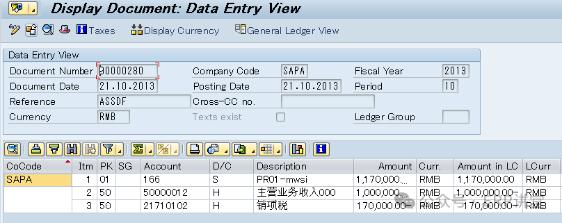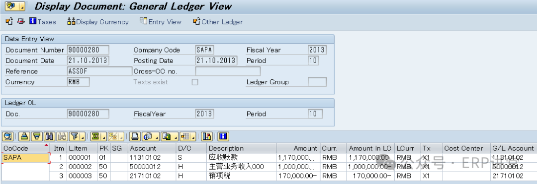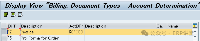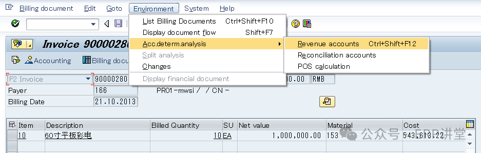 开票 借:应收帐款 贷:销售收入 销项税 应收帐款科目:客户的统御科目 收入: 在VF03发票界面可以分析收入科目 分析结果:通过科目确定procedure KOFI00的access10 KOFI 的KEY组合 COA :SACN 销售组织:SAPA ,客户的科目确定组:01,物料的科目确定组:01,科目码:ERL 来确定出科目50000012