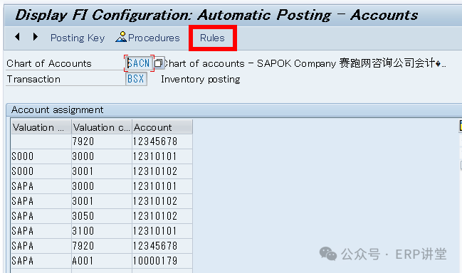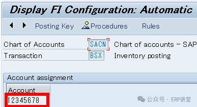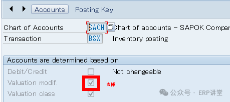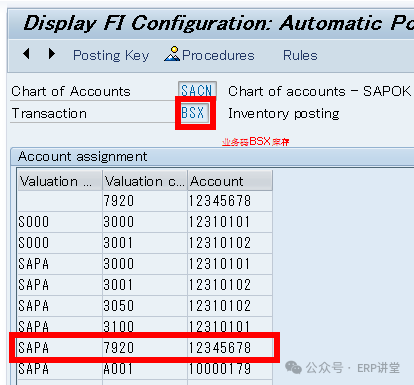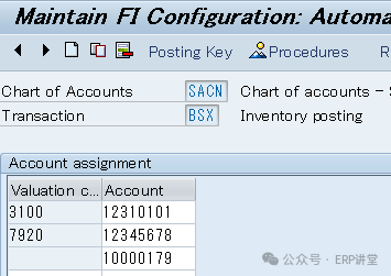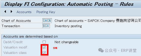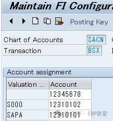 这样对库存科目有以下几种配置方案 方案1 整个公司所有类型物料用一个库存科目 在OBYC中对业务码BSX的规则估价修改,评估级别都不选 12345678:库存科目