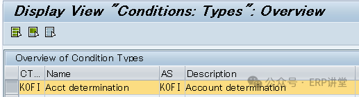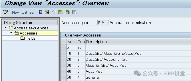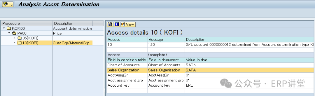 condition type KOFI->access sequence KOFI access sequence KOFI有好多个Access,按顺序查找 先找10,价格PR00的科目码是ERL,客户科目组01,物料科目组01,找到科目50000012。 这种方案是按客户/物料来分收入科目 客户分为海外/国内,物料分为大宗商品/易耗品 这样收入科目就分为 海外大宗商品销售收入/海外易耗品销售收入/国内大宗商品销售收入/国内易耗品销售收入