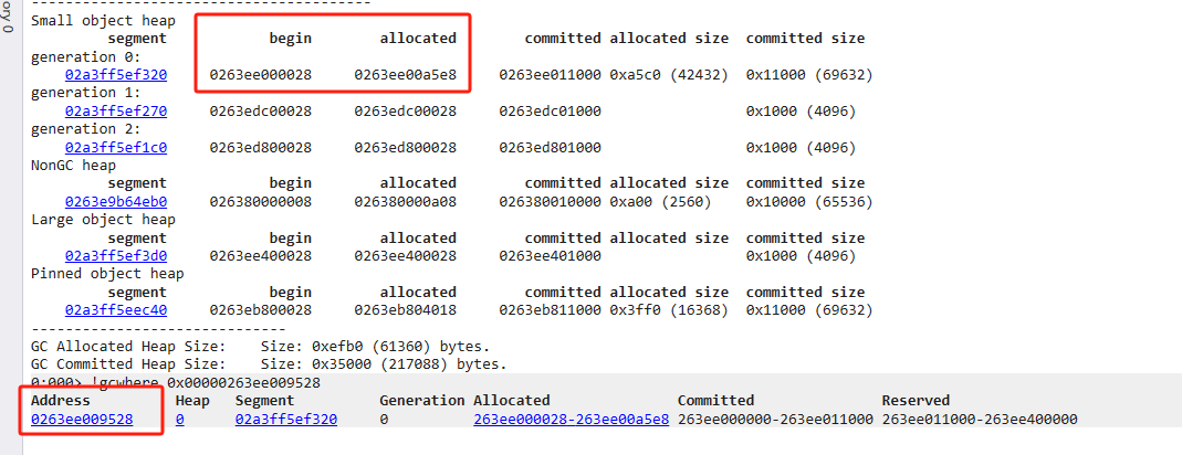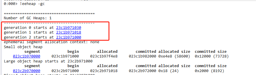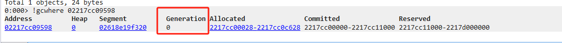 obj对象刚创建,为0代 第一次GC,obj升为1代 第二次GC,obj升为2代 代边界 细心的朋友会发现一个盲点,就是obj刚刚创建的时候,0代内存起始点为0263ee000028,升为1代后,1代内存起始点也变为了0263ee000028,2代也同样。