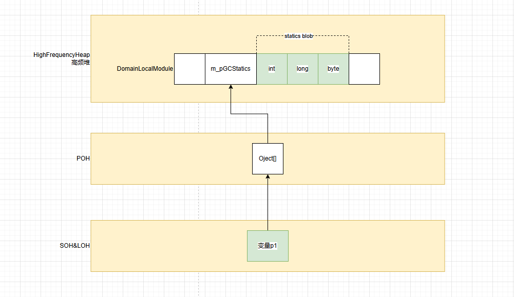 静态的引用类型则不同。真正的对象存放在托管堆上,再由POH中一个object[]持有,最后被高频堆中的m_pGCStatics所管理