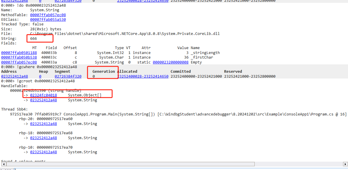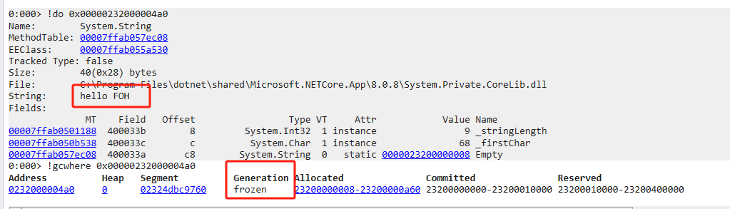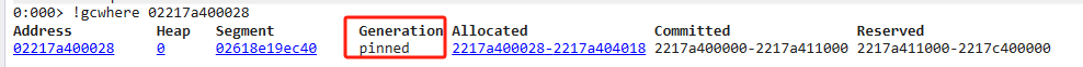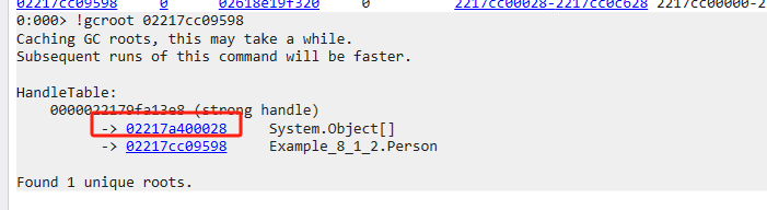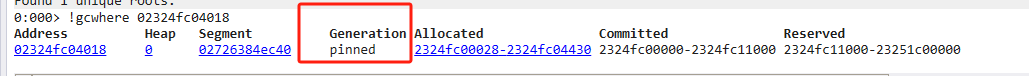 使用!gcwhere命令来查看person对象属于0代中,说明对象本身分配在托管堆