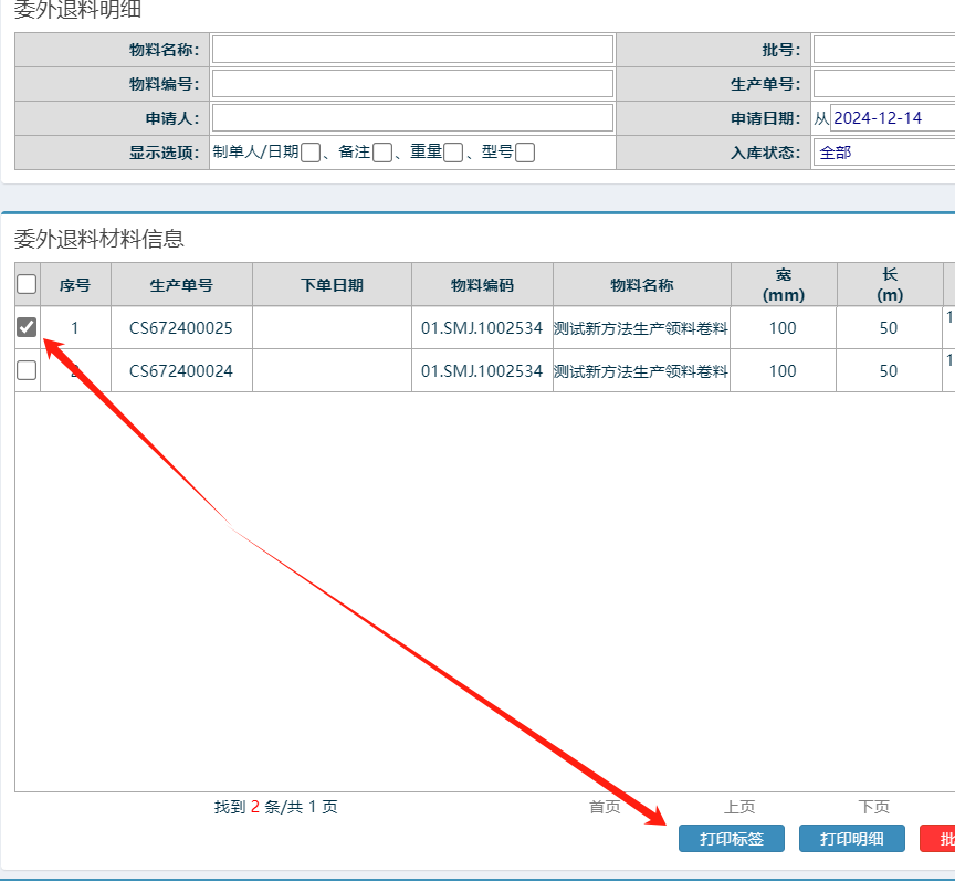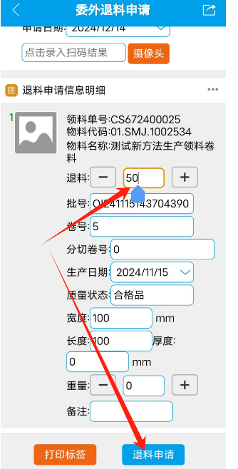 ![]() ![]() 点击进入 如下图: 修改米数后,点击退料申请 如下图: 然后到电脑端打出标签贴上 如下图: 勾上要打印的标签的信息后,点击打印 如下图: ![]() 点晴模切ERP更多信息:http://moqie.clicksun.cn,联系电话:4001861886 该文章在 2024/12/14 14:48:30 编辑过 |