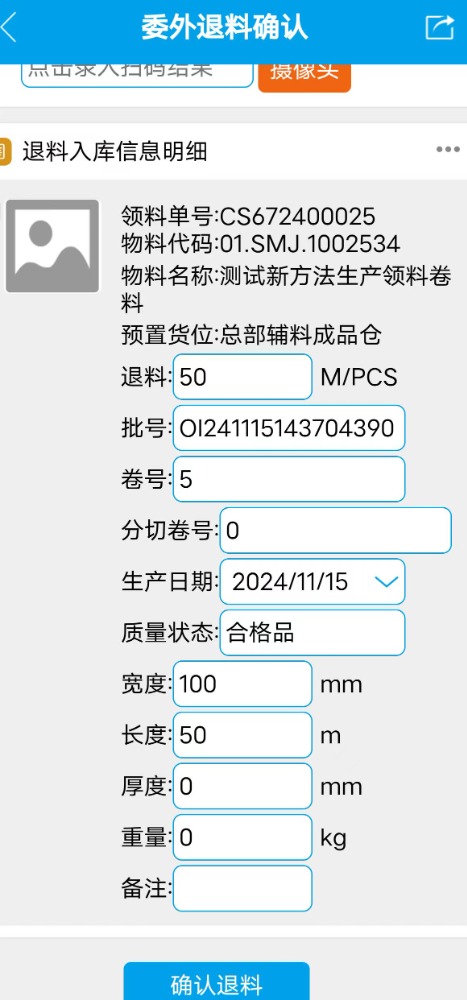 ![]() 点击进入 如下图: 扫描委外退料标签的信息,然后点击确认退料入库 如下图: ![]() 点晴模切ERP更多信息:http://moqie.clicksun.cn,联系电话:4001861886 该文章在 2024/12/14 14:52:07 编辑过 |