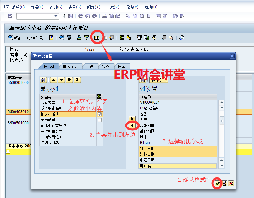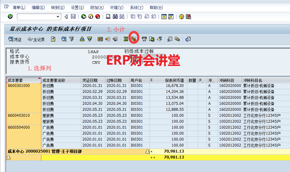 发生了哪些成本?金额是多少?我们可以通过报表S_ALR_87013611进行查询,这个报表非常重要,我们一定要掌握!如果要查询成本中心的费用明细,我们可以使用报表KSB1。KSB1可以按时间段查询成本中心的费用明细,在“更多设置”中可以设置输出的行项目数,以及输出的格式。与报表S_ALR_87013611不同,KSB1展示了成本中心的费用明细,按时间先后顺序依次输出。选择红圈中的图标,可以根据需要设置显示内容。如果要按成本要素查看费用总数,选择成本要素列,点击红圈中的图标进行小计即可,效果如下。提醒:报表S_ALR_87013611重在分析成本中心费用的计划数和实际数,以及差异率;报表KSB1重在分析成本中心的费用明细。二者侧重点略有不同,都是常用的成本中心报表。