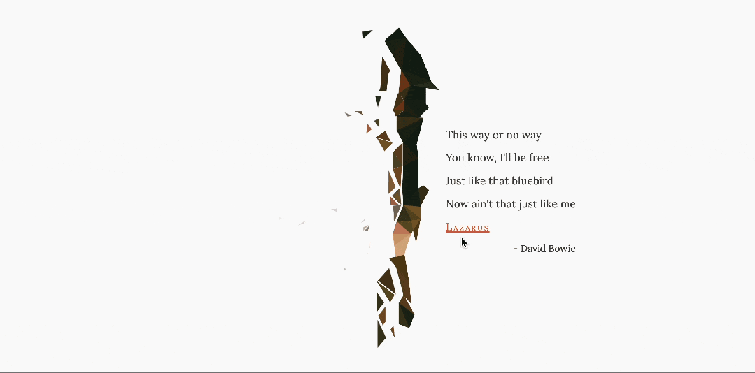 向David Bowie致敬这款低多边形动画以已故音乐偶像David Bowie为主题,使用jQuery实现了炫目的动态效果。作为科技迷的Bowie,也许会对这样的致敬方式感到欣喜。 源码: https://codepen.io/woodwoerk/pen/bERRrM