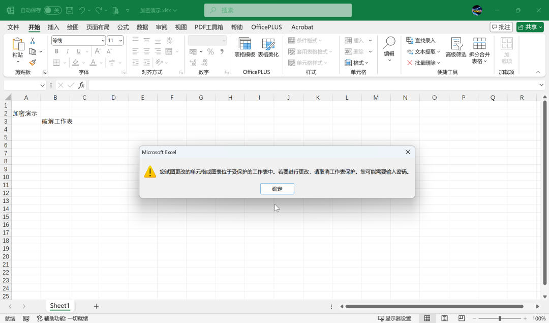 “您试图更改的单元格或图表位于受保护的工作表中。若要进行更改,请取消工作表保护。您可能需要输入密码”