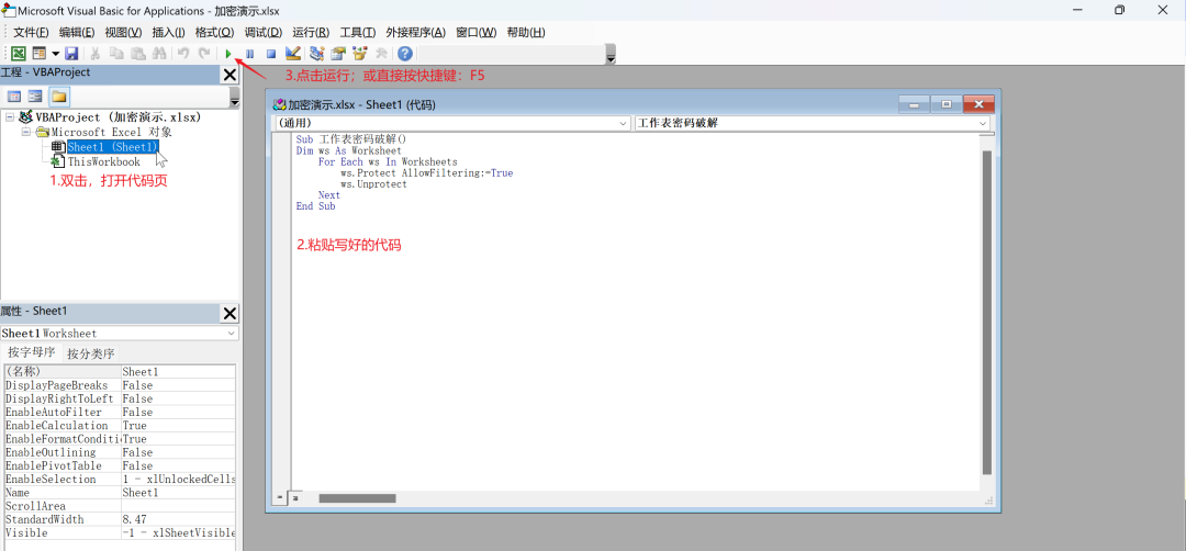 Sub 工作表密码破解()Dim ws As Worksheet    For Each ws In Worksheets        ws.Protect AllowFiltering:=True        ws.Unprotect    NextEnd Sub