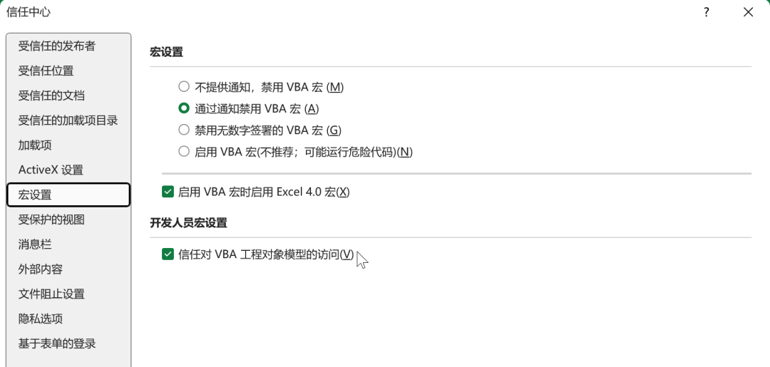 PS.如执行代码报错,则在"信任中心" → "宏设置" → 勾选"启用VBA宏"、“信任对 VBA 工程对象模型的访问”