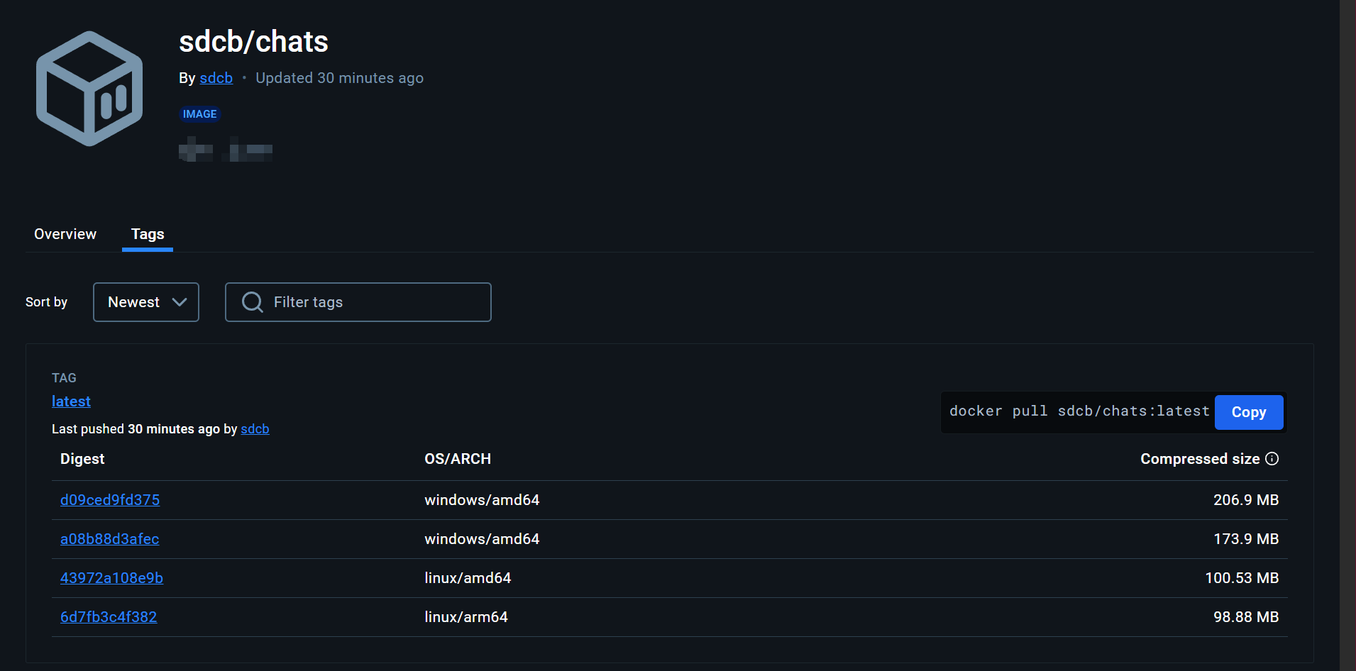 通过使用 docker.io/sdcb/chats:latest 这样的 Docker 标签,Docker 会根据您的操作系统和平台架构(如 amd64、arm64 等)动态选择合适的 Docker 镜像下载,这大大简化了部署流程。Chats 提供了以下几个镜像: